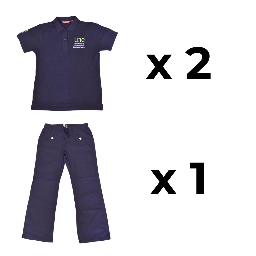 Need the basics for your UNE nurse attire? Look no further! This pack includes 2 x official UNE Student Nurse polo’s as well as 1 x pair of official UNE branded scrubs!
